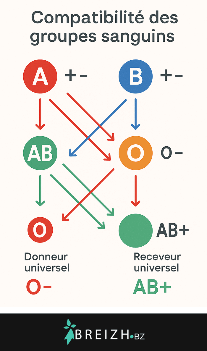 Pour rappel, le groupe O- peut seulement recevoir du sang de son propre groupe au contraire du groupe AB+ qui peut en recevoir de tous. De même, le groupe A ne peut recevoir du sang de groupe B et inversement.